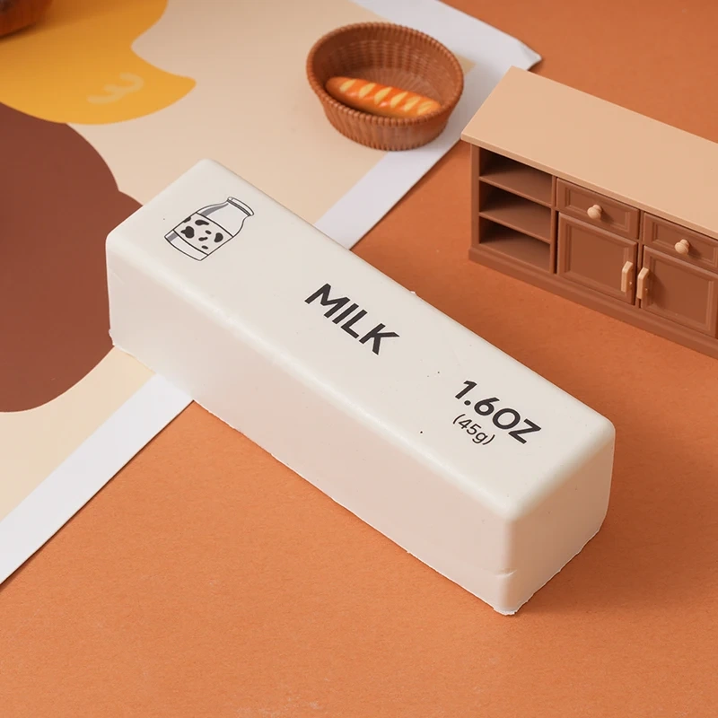 Each squishy features cute and realistic food-themed designs including creamy butter sticks, tasty chocolate bars, wedges of cheese, milk cartons, and sweet fruit flavors that look good enough to eat but are made for squeezing.